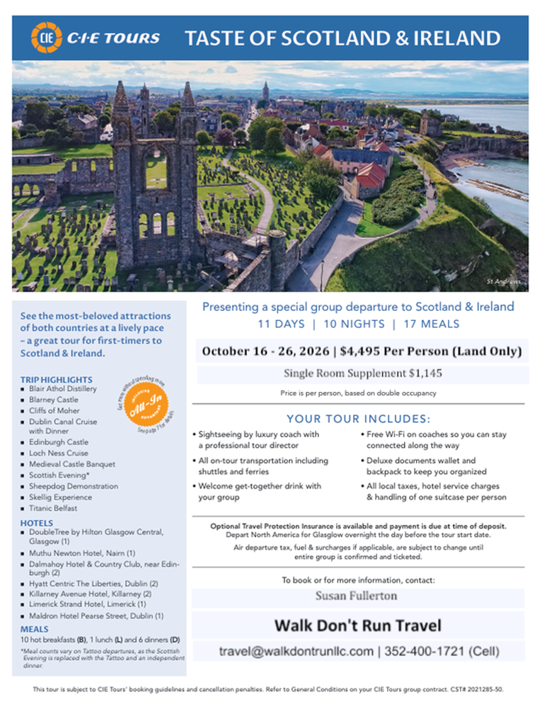 Welcome to Walk Don't Run Travel, where we believe that the journey should be just as enjoyable as the destination. Our mission is to make your travel experiences convenient, fun, and easy. Based in the charming city of Inverness, Florida, we proudly serve clients nationwide, helping you get to the destinations you love. Whether you're dreaming of exploring the vibrant streets of Europe, the serene landscapes of Alaska, the exotic locales of Asia, or the sun-kissed shores of the Caribbean, we are here to turn those dreams into reality. Our team is dedicated to curating the perfect travel packages that include everything from airfare and comfortable lodging to immersive tours and unforgettable experiences.